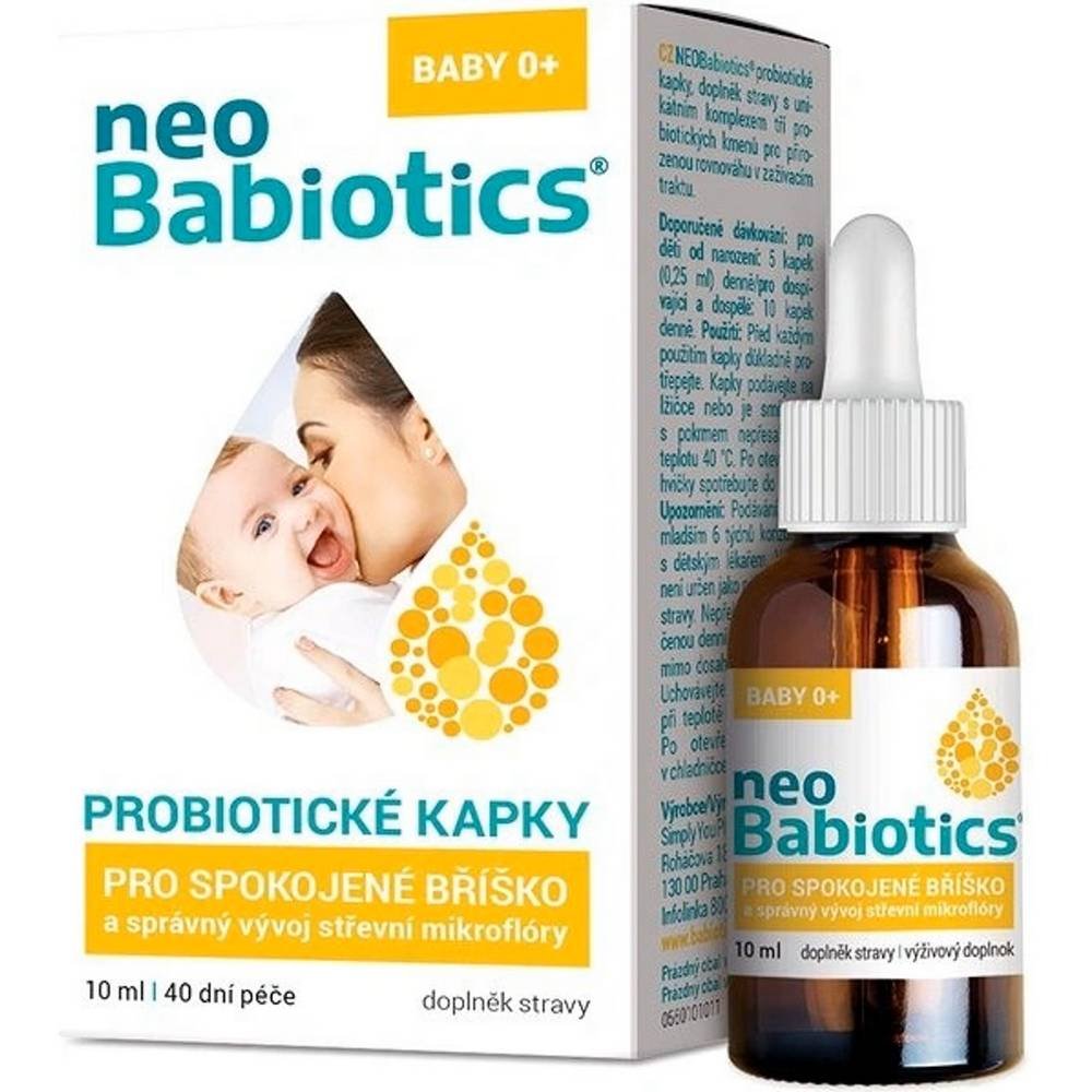 Each package contains a 10ml bottle of Simply NEOBabiotics probiotic drops with a calibrated dropper for precise administration. The resealable bottle ensures freshness, portability, and convenient daily use for infants and young children.